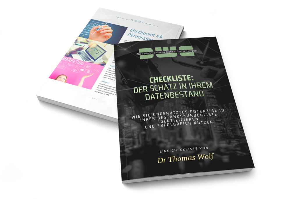 Begeben Sie sich noch heute auf die Suche nach Ihrem Schatz in Ihrem Datenbestand. Laden Sie sich unsere Checkliste gratis herunter und nutzen Sie das Potenzial für mehr Vertriebserfolg. Sie erhalten damit eine fundierte sowie erprobte Anleitung für die Erhöhung der Kundenbindung Ihrer Bestandskunden und die Steigerung des Kundenwerts Ihrer unbetreuten Bestände.